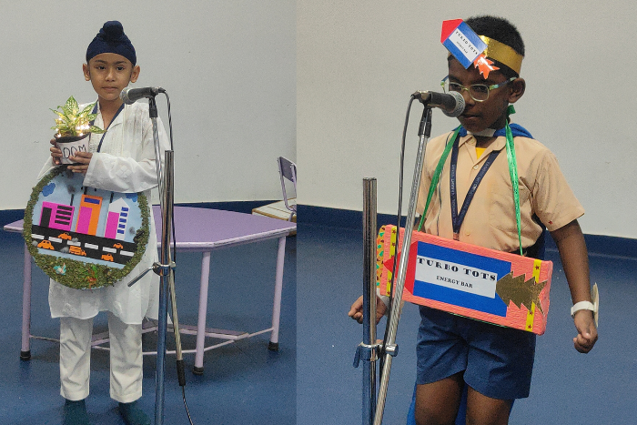 The Intra-Class Competition Brand Blitz (Ad making) for Class II was held on Thursday, 30 October 2025, featuring six participants from each section. Students showcased their creativity by advertising unique products such as a cough syrup, a magic talking book, a magic pillow, a super energy drink, an air pollution kit, a magic pencil, etc. With imaginative costumes, lively props, and catchy jingles in both English and Hindi, they turned the stage into a vibrant display of talent. The performances brimmed with humour and confidence, leaving the audience entertained and thoroughly impressed by the young advertisers’ ingenuity and charm.