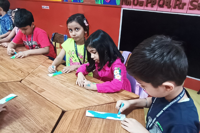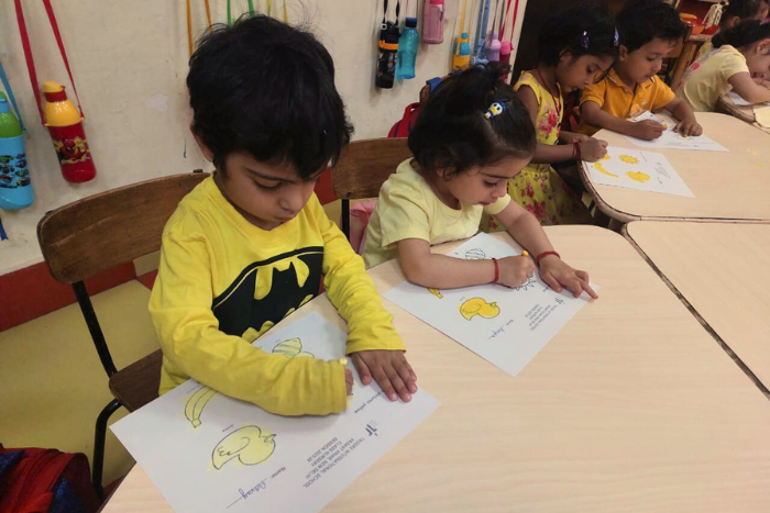 Observe and match the correct colour stick activity by the students of class Nursery