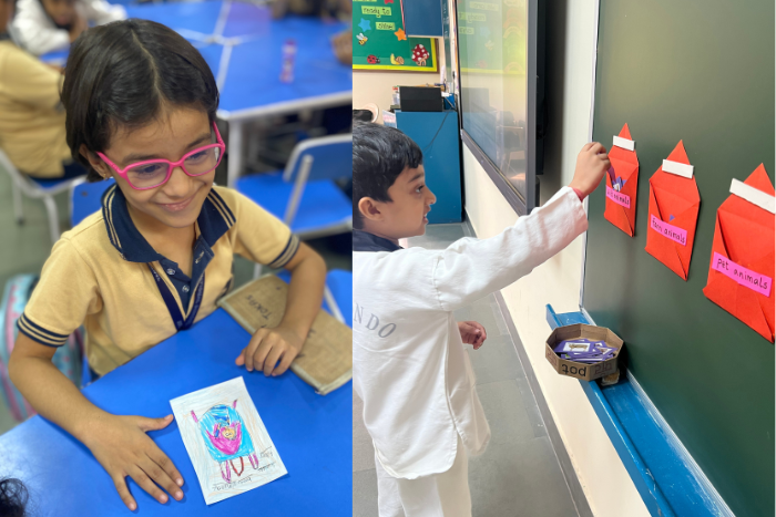 Students of Class I engaged in a series of interactive activities that enhanced creativity, critical thinking and awareness. In English, they designed their dream school bag, decorating them with vibrant colours and writing about four essential items they carried daily. In Math, they explored addition through the fun-filled ‘Addition Machine,’ where they dropped counters into slots and recorded the resulting equations. For General Awareness, they participated in an ‘Animal Sorting Game,’ categorizing animals as wild, farm or pet. These activities fostered creativity, logical reasoning and environmental awareness among young learners.