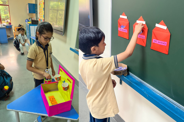 Students of Class I engaged in a series of interactive activities that enhanced creativity, critical thinking and awareness. In English, they designed their dream school bag, decorating them with vibrant colours and writing about four essential items they carried daily. In Math, they explored addition through the fun-filled ‘Addition Machine,’ where they dropped counters into slots and recorded the resulting equations. For General Awareness, they participated in an ‘Animal Sorting Game,’ categorizing animals as wild, farm or pet. These activities fostered creativity, logical reasoning and environmental awareness among young learners.
