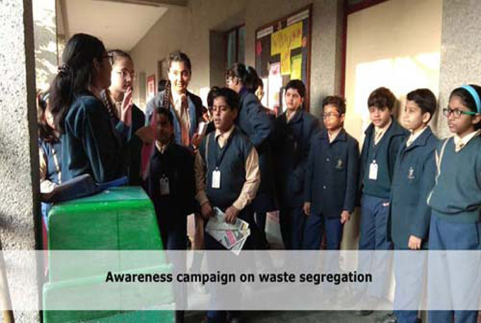 To tackle the challenge of waste segregation, Class VIII students led a hands-on awareness drive for Classes IV and V — guiding them to dispose of waste in the correct bins while explaining the difference between blue and green dustbins and what counts as biodegradable vs. non-biodegradable waste.