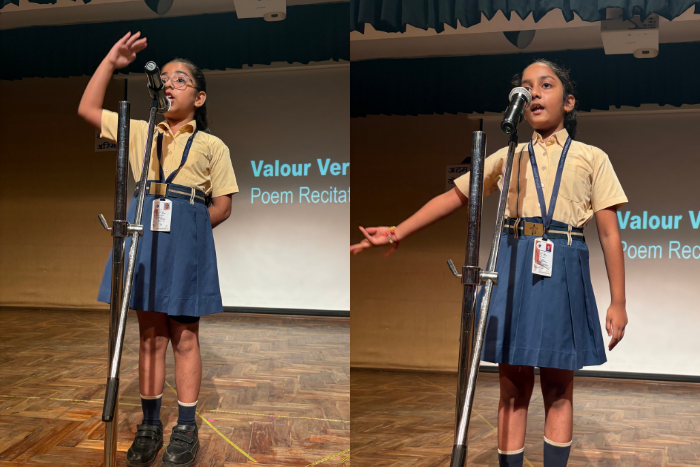 Poem Recitation Competition ‘Valour Verse’ was held for Class IV students on 22 August, 2025. The event celebrated the courage and bravery of heroes through powerful poetry. Young participants recited poems with confidence and expression, bringing alive stories of strength, sacrifice and patriotism. The audience was inspired by their confidence and heartfelt emotions. The judges appreciated the effort and talent of every child. The competition not only enhanced students’ speaking skills but also helped them develop the love for poetry and literature.x`x