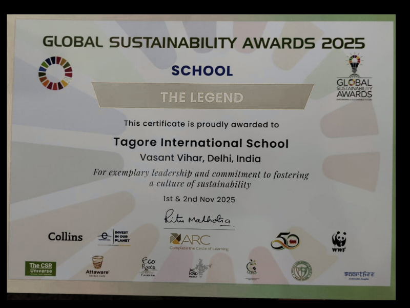 Tagore International School, Vasant Vihar has been awarded ‘Best Eco friendly School- Silver Award’ nationally by Global Sustainability Awards in December 2021 for being Frontrunners in Sustainable Practices, for working towards protecting the environment and improving school campus, for undertaking projects such as paper recycling, rain water harvesting, waste segregation, recycling of tetra packs, separate bins for e-waste and bio waste and more. TISVV embodies the spirit of sustainability and integrates the values of the UN SDGs within curriculum and activities.