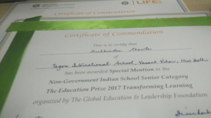 Ms. Kulbinder Chawla, TGT Mathematics received a Special Mention Award by The Global Education & Leadership Foundation for transforming learning by her teaching methodology in the Non- Government Indian School Senior Category .