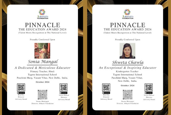 We proudly celebrate the exceptional achievements of six dedicated educators—Dr. Vibha Vijay, Ms. Meenakshi Tickoo, Ms. Abha Ratra, Ms. Monica Kakkar, Ms. Sonia Mangal and Ms. Shweta Chawla —who have been honoured with the prestigious Pinnacle –The Education Awards 2024. This national-level recognition highlights their outstanding contributions to transforming the lives of their students through innovative teaching practices and their unwavering commitment to meaningful education. Among only 55 finalists across 10 States and 2 Union Territories, these teachers exemplify excellence in education and dedication to fostering a positive learning environment. Their efforts have contributed significantly to the growth of the institution and the overall development of the students. Tagore International School commends their passion and looks forward to seeing the continued impact they will make. Our teachers’ dedication continues to shape the future, one student at a time.