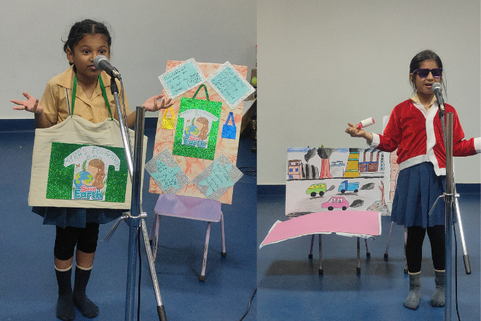 The Intra-Class Competition Brand Blitz (Ad making) for Class II was held on Thursday, 30 October 2025, featuring six participants from each section. Students showcased their creativity by advertising unique products such as a cough syrup, a magic talking book, a magic pillow, a super energy drink, an air pollution kit, a magic pencil, etc. With imaginative costumes, lively props, and catchy jingles in both English and Hindi, they turned the stage into a vibrant display of talent. The performances brimmed with humour and confidence, leaving the audience entertained and thoroughly impressed by the young advertisers’ ingenuity and charm.